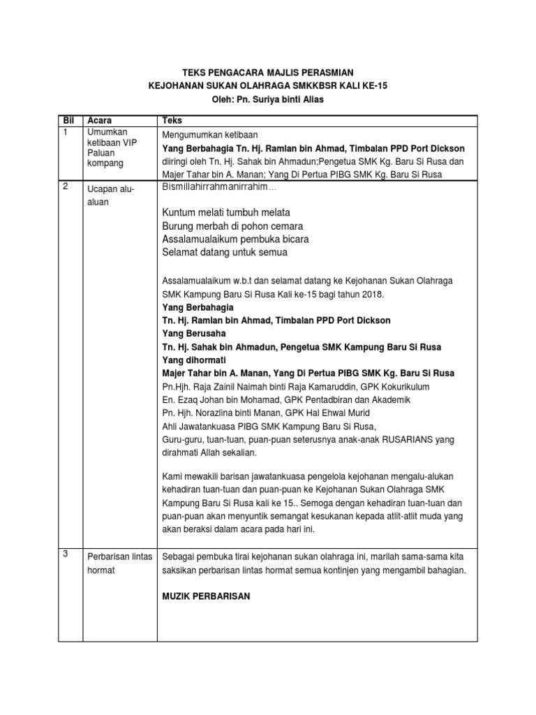 Majlis dikategorikan kepada dua iaitu rasmiformal atau tidak rasmitidak formal. Teks pengacara sukan 2017. Puan Halimaton Hashim Guru Besar Sekolah Kebangsaan Lubok Kulit Kuala Lipis Pahang Guru-guru dan seterusnya Para pelajar yang dikasihi sekalian.